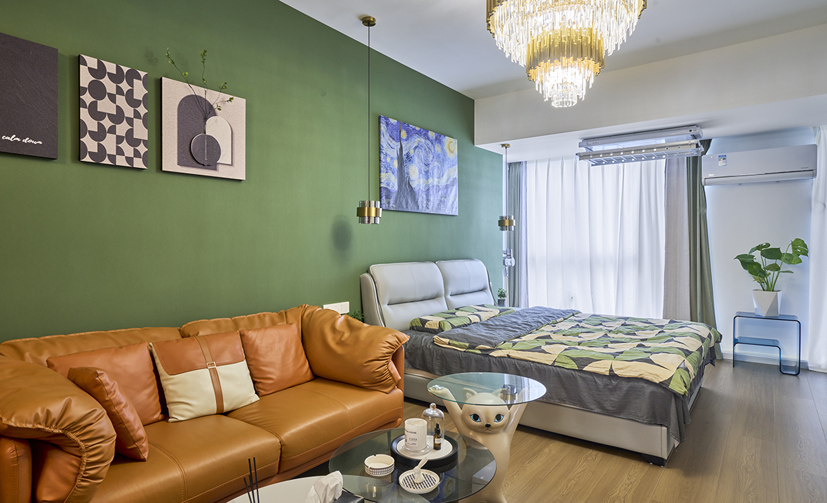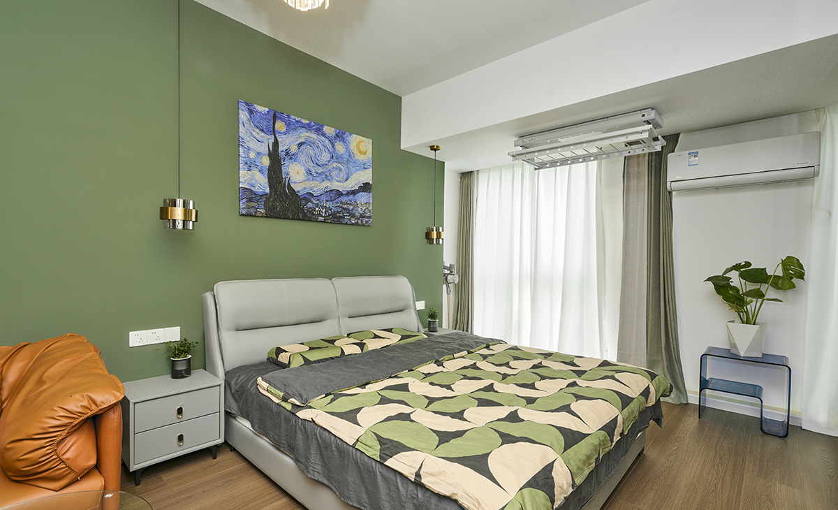 臥室綠色的墻面和灰色的皮革相呼應,讓家不呆板,比較靈活。窗簾也是一個亮點,棕色,灰色的布簾搭配白色的沙簾,讓整個空間眼前一亮。