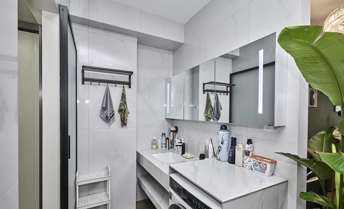 衛生間濕區槍灰色邊框淋浴房和純色的墻磚,讓衛生間簡約顯大不花哨