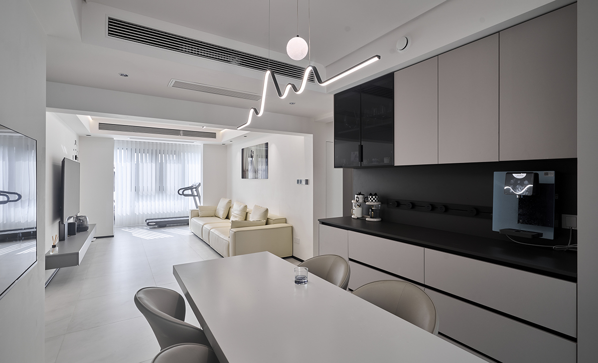 餐廳空間比較方正,整面餐邊柜和餐桌顏色呼應,配以黑色極窄邊框玻璃門,若隱若現,很夢幻、頂面曲線吊燈是一大亮點,把空間點綴地恰到好處。