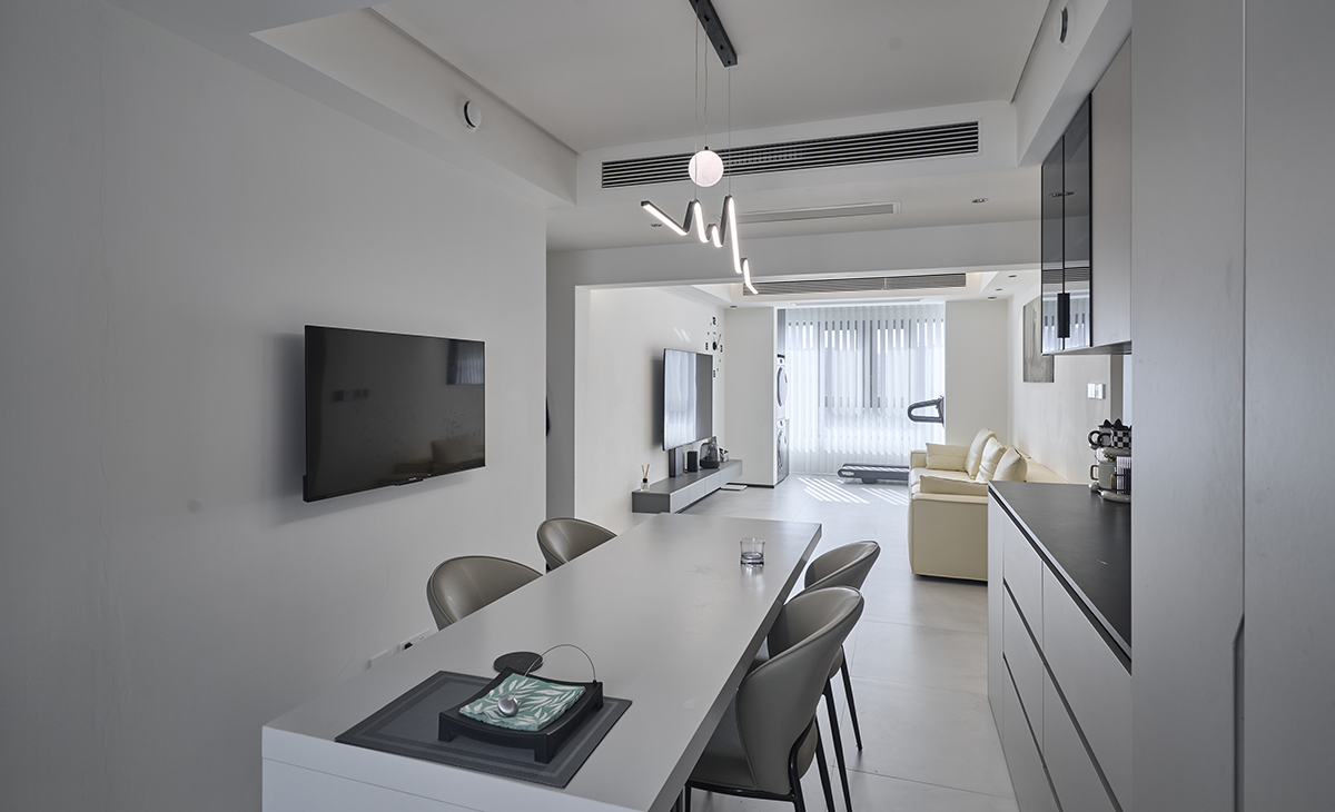 客廳采用去茶幾化設計,體現現代極簡風格的簡潔時尚,空間方正大氣、電視背景采用白色墻+時鐘掛畫設計,讓空間不單調。