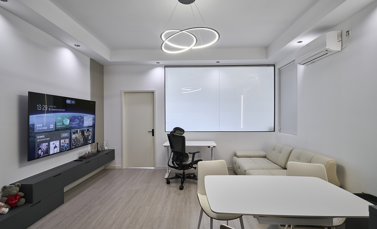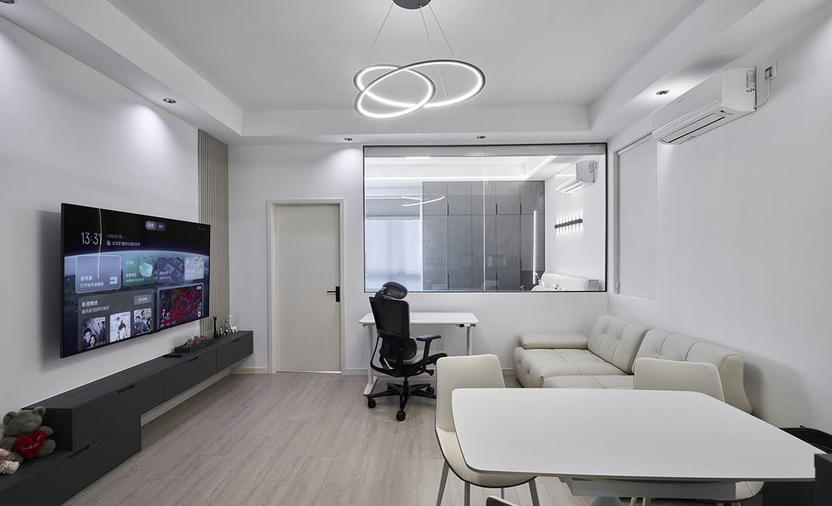 客廳是一套房子的靈魂所在,餐邊柜加上延長的電視柜能最大化保證客戶的儲物需求,客戶平時,簡單的石膏回字吊頂加上筒燈,把客廳的氛圍感拉滿