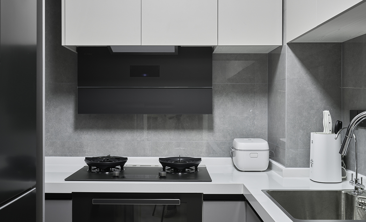 廚房占地5個平方,L型的櫥柜,加上方太的集成烹飪中心和水槽洗碗機,滿足了業主廚房的所有需求