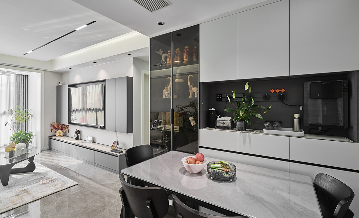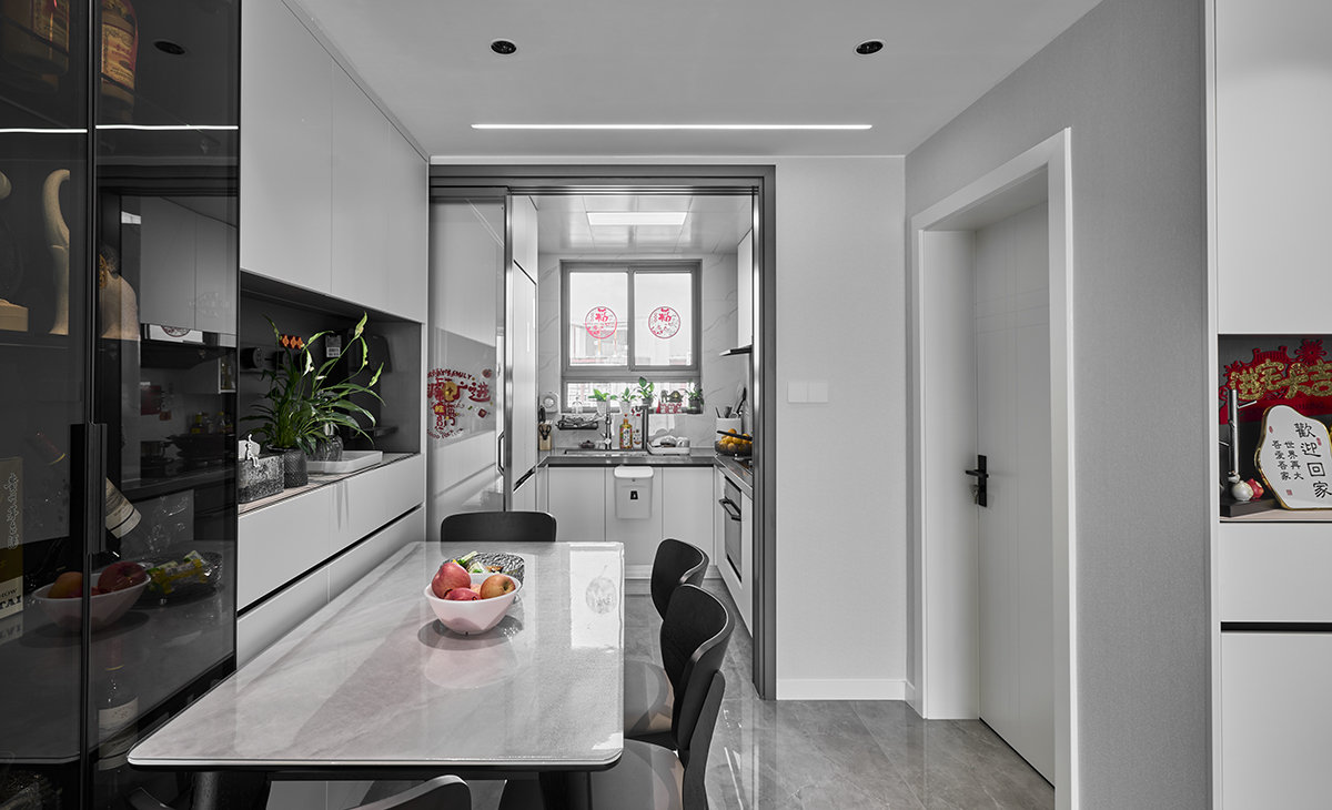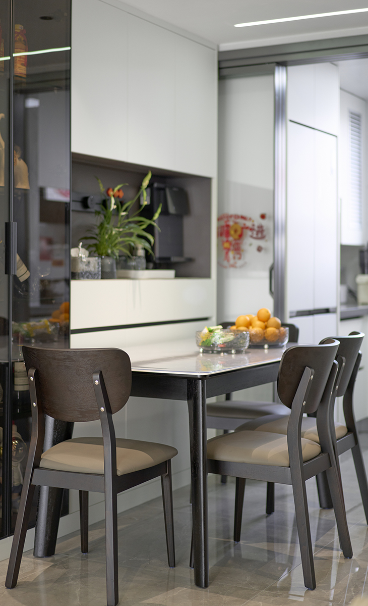 餐廳白色的櫥柜巧妙融入墻壁,白色島臺與純黑餐桌形成對比,沉穩而不失格調。餐廳、廚房與客廳無縫銜接,營造出溫馨的生活氛圍?。
