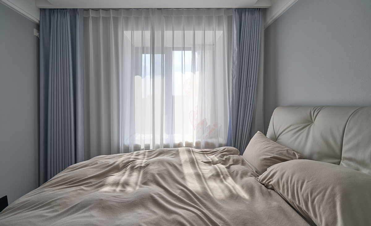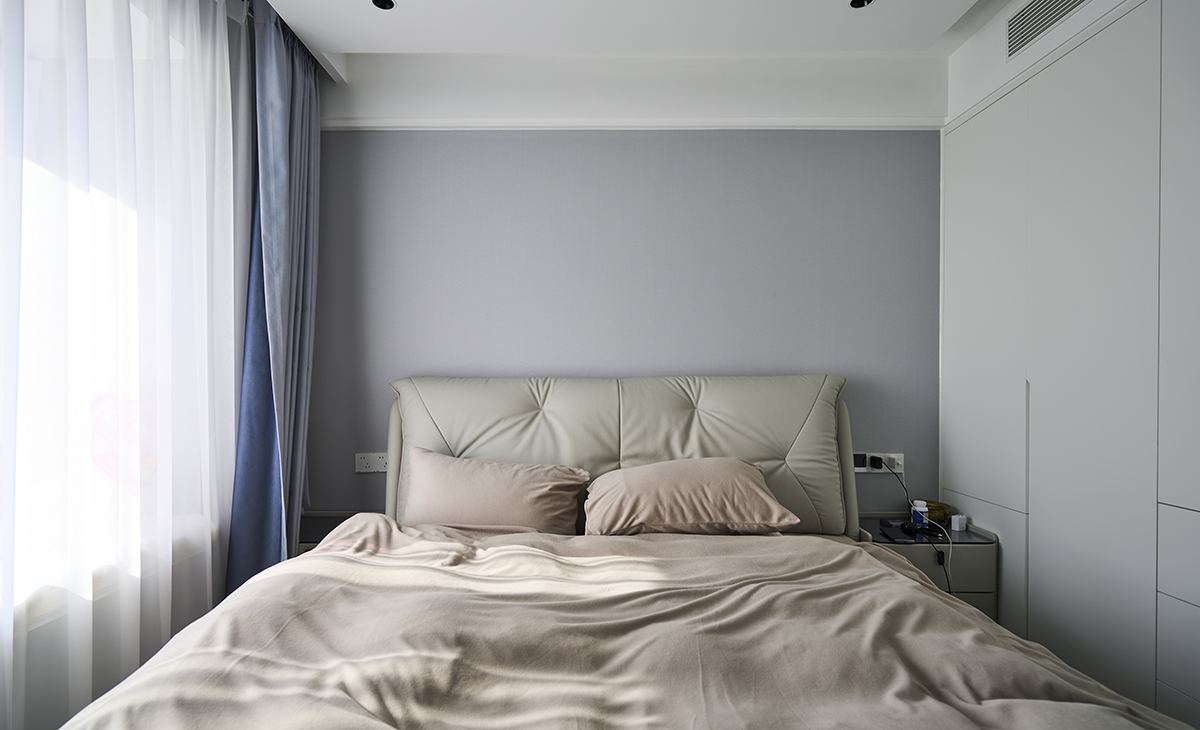 次臥以白色與淺灰色墻布作為主要配色,營造寧靜舒適的氛圍。結合石膏板做層次立方體,功能簡化為睡眠區?。