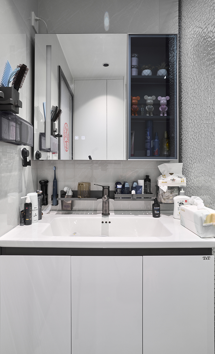衛生間整體采用灰黑木的組合,增添空間的精致感。布局注重整潔性和功能性,可通過合理設置洗漱臺、馬桶、淋浴區等區域,提高使用效率?。