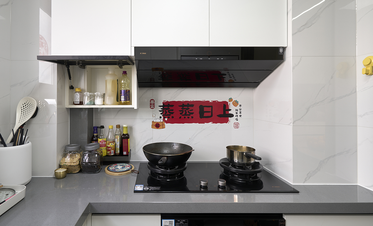 靠窗設計保證充足光亮;右邊黑色主打的廚房區域,櫥柜和油煙機選用深沉黑色。
