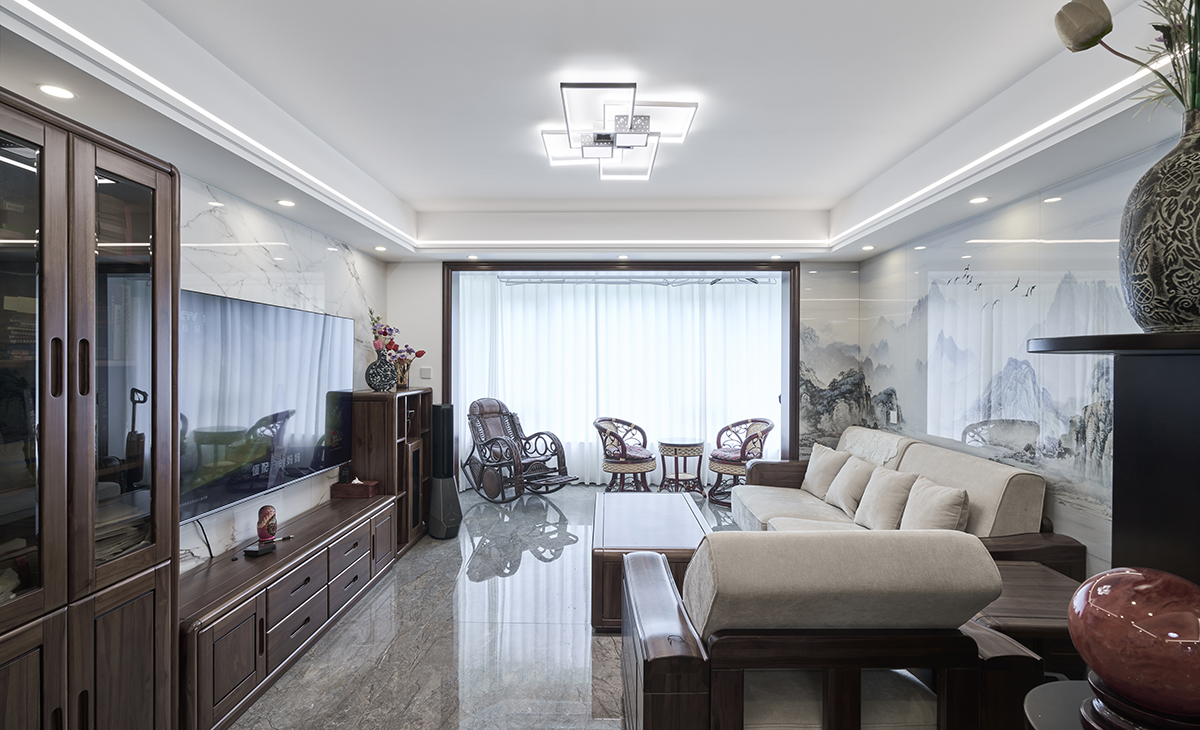 客廳是接待客人的空間、是家庭裝修的亮點所在、也是一家人活動頻率最高的區(qū)域,米色皮質(zhì)沙發(fā)和白色山水畫巖板相呼應(yīng),體現(xiàn)高端華貴,吊頂造型上采用方形石膏板+雙眼出線型燈,實木電視柜和茶風(fēng)、條幾上放一裝飾擺件。地面采用灰色玻化地磚。造型和色調(diào)上無不體現(xiàn)新中式風(fēng)格的厚重和高貴。
