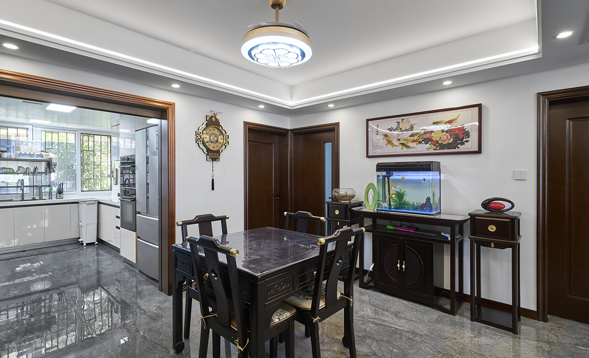 餐廳采用實木方桌,中式玄關(guān),中式餐邊柜,體現(xiàn)中式風(fēng)格的簡潔時尚,方正大氣、矮柜上的魚缸很有仙氣,頂面中式吊燈,配上線型燈,讓空間溫馨、大氣。