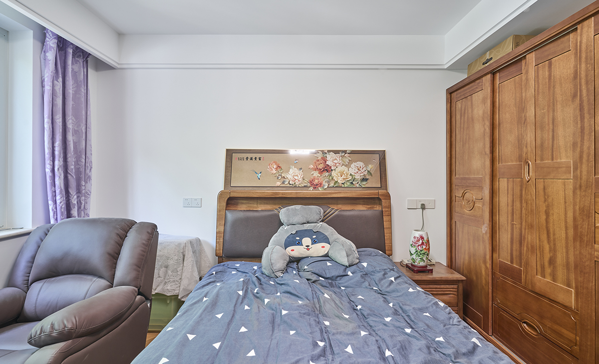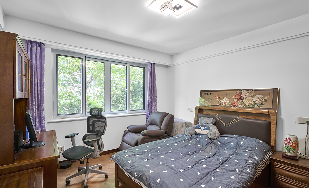 次臥作為多功能室,主要供叔叔阿姨當(dāng)書房用,偶爾子女過來也能小住,床邊上有一個沙發(fā),讓叔叔累了可以放松一下。