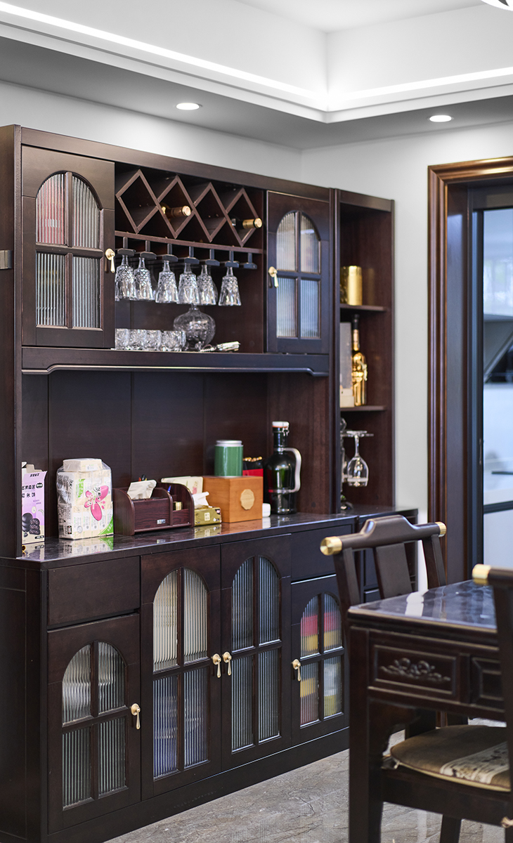 中式玄關(guān),中式餐邊柜,中式吊燈,深色地磚,整潔干凈,方便打理,餐桌頂面吊燈是一大亮點,把空間點綴地恰到好處。