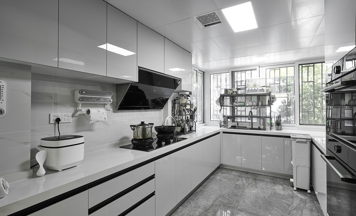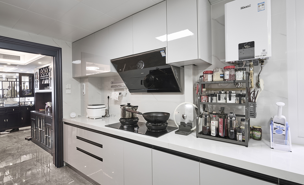 該套房子廚房空間很大,U字型櫥柜,洗碗機、蒸烤箱,微波爐等電器全配,兩排6個抽屜,上下柜都是白色,臺面白色,方便打理,墻地磚的顏色和櫥柜顏色搭配地很自然,客戶不斷地夸贊設(shè)計師對色彩的精準(zhǔn)把握。