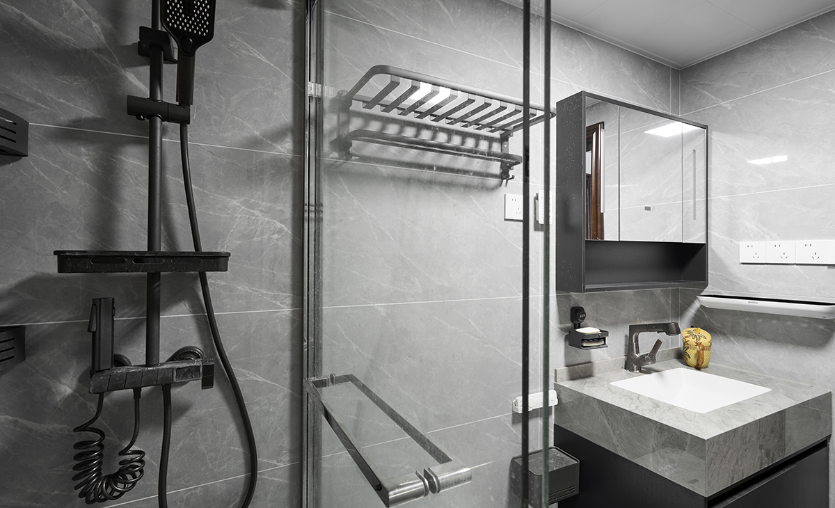 客衛(wèi)淺灰色墻地磚,槍灰色臺盆柜,白色石英石臺面、槍灰色龍頭,智能馬桶,體現(xiàn)了客戶的高檔生活品質(zhì)。