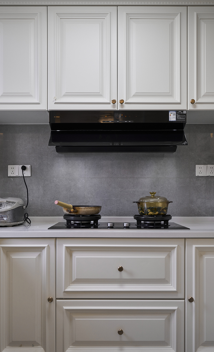 打破廚房的封閉感,使其成為家庭社交、親子互動的核心區,功能強大且美觀。五金件選用金色、古銅或鎳拉絲的復古樣式。墻面常用地鐵鋪貼,搭配開放式層板和懸掛桿系統,讓廚具成為裝飾。西廚區增加補充了廚房間和餐廳的收納 恰到好處。