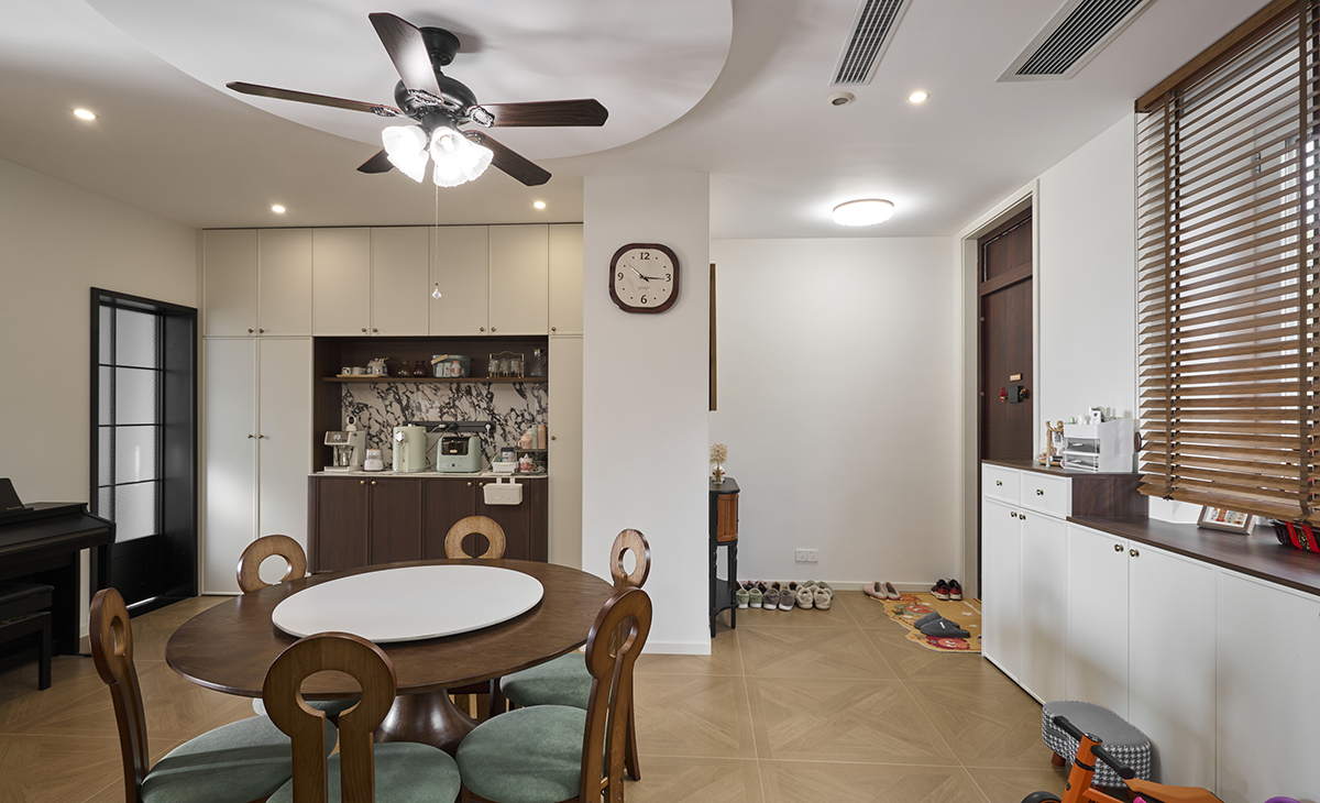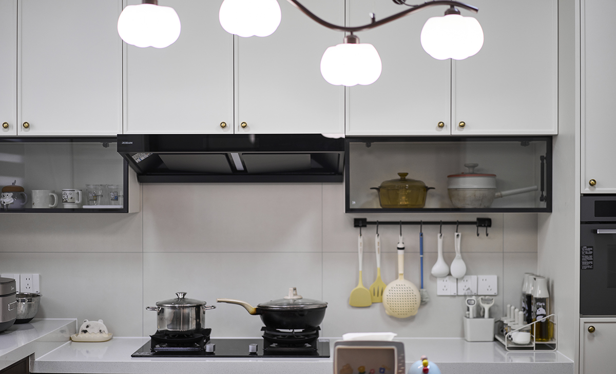 胡桃木裹著暖光,黃銅拉手碰著煙火廚房,是復古調里的人間煙火氣。