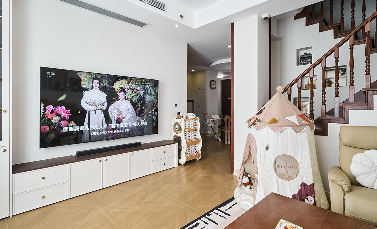 該居室主人是國企中等管理人員,居住一家四口,一個女孩,一個男孩,中古風的靈魂,復古和摩登的碰撞,色彩搭配木質元素遇上復古設計,在顏色的搭配上選,低調而不失高級溫暖的大地色家具,沉穩的胡桃木,白色的純凈,他代表著純潔寧靜和自由。以白色為主色調,局部用胡桃木點綴。中古風不僅是一種風格,更是一種生活態度。