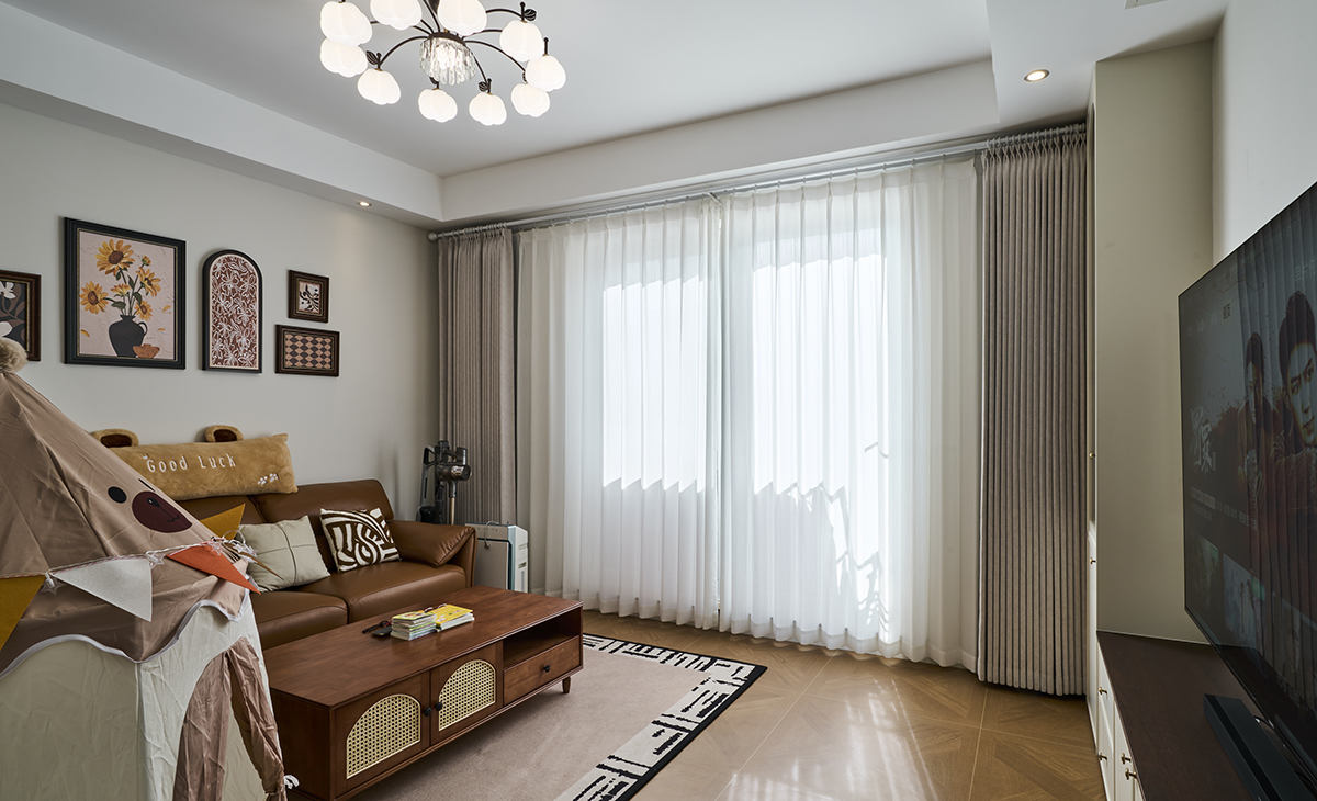 客廳是接待客人的空間、也是活動相聚最多的地方。大地色的沙發,將復古花磚鋪進客廳,再擺上一張木質和茶幾,白墻為紙,木作為墨,幾幅小墨小品懸于壁上,亞麻窗簾隨風輕擺,中古風的雅致,在一呼一吸間悄然流淌。