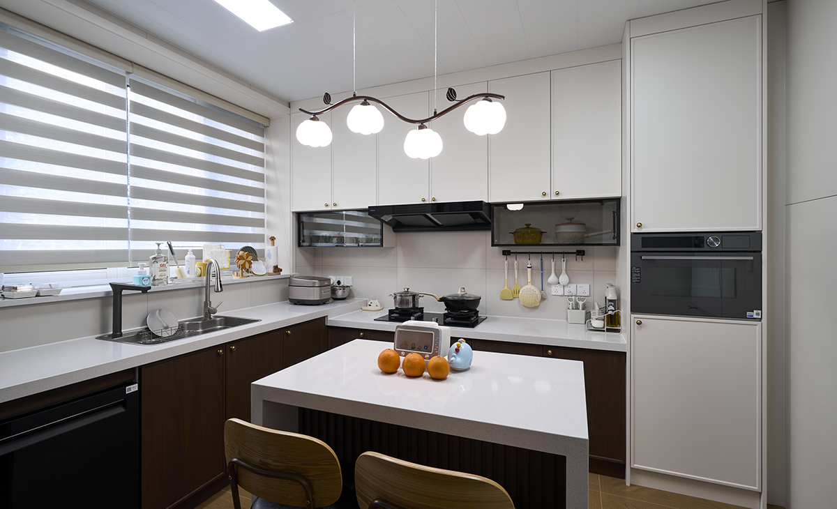 百葉窗篩碎的光,落在樹枝吊燈的奶白球上,連洗個碗都像在復古電影里。