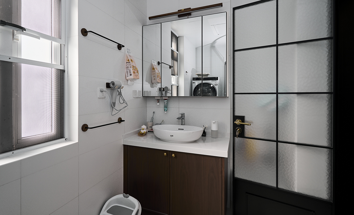 以通體白色瓷磚為主,干凈好打理,搭配黑色金屬配件(毛巾桿、淋浴房框)做線條點綴,簡約不單調。花磚細節:地面用了白色底 + 棕色小菱形花磚,沒有大面積鋪陳,只以小圖案點綴,既保留了花磚的精致感,又不會讓小空間顯得雜亂。